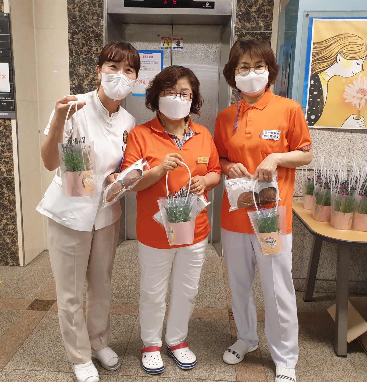 여성분들에게는 화분과 빵을, 남성분들에게는 빵을 나누어 드렸습니다.