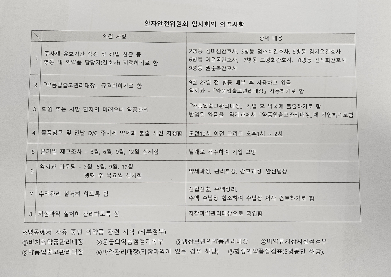 병동 내 효율적인 약품 관리 방법 모색 건으로 회의를 진행하였습니다.