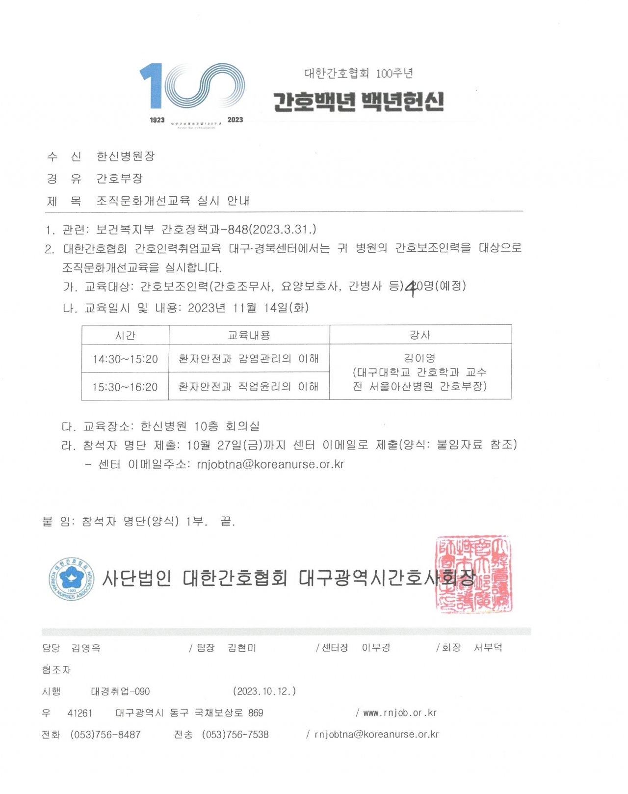 (의)용각의료재단 한신병원과 대한간호협회와 함께 조직문화개선 교육을 실시하였습니다.