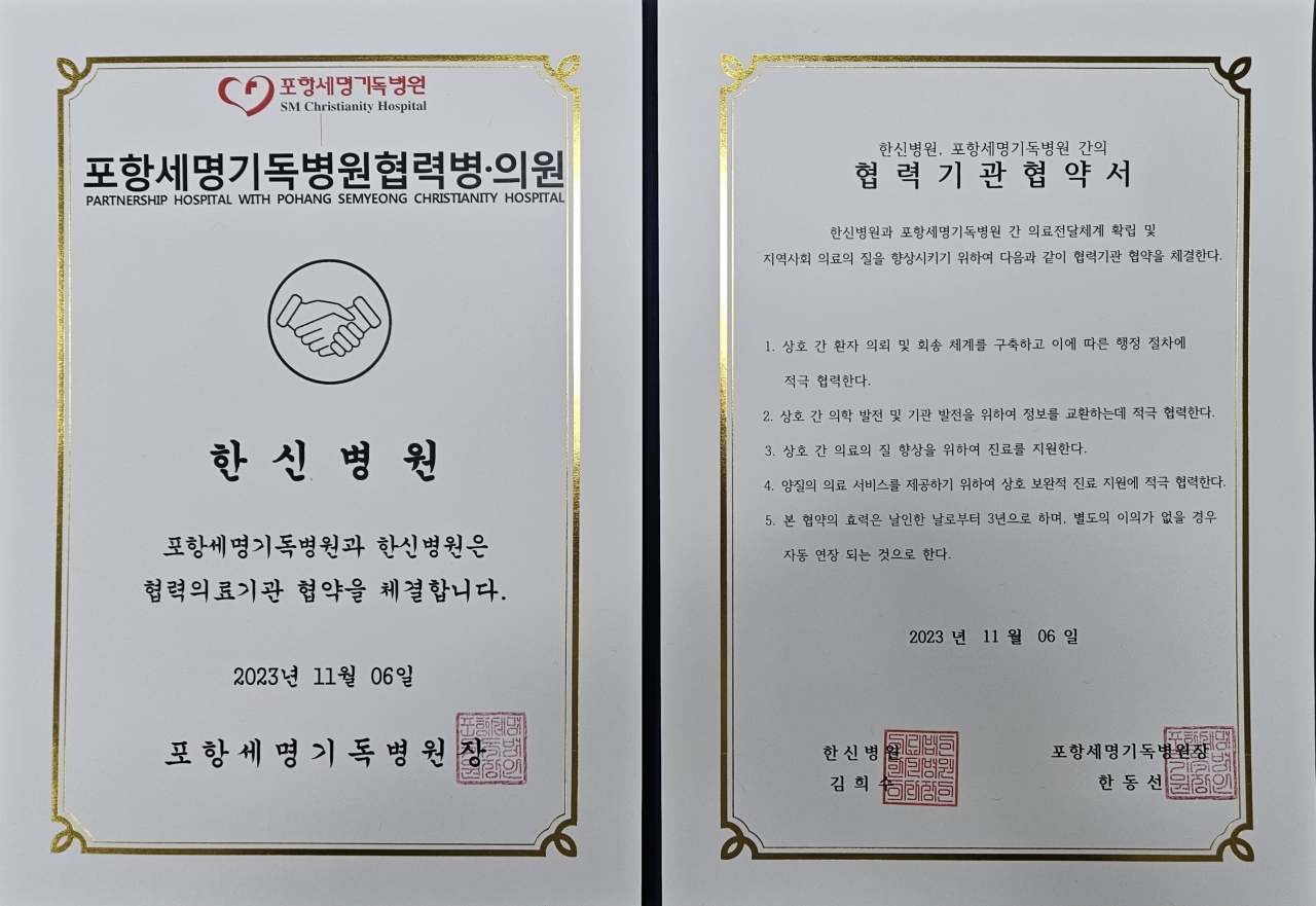 23년 11월 06일 (의)용각의료재단 한신병원과 포항세명기독병원이 서로 협력병원으로 협약을 체결하였습니다.