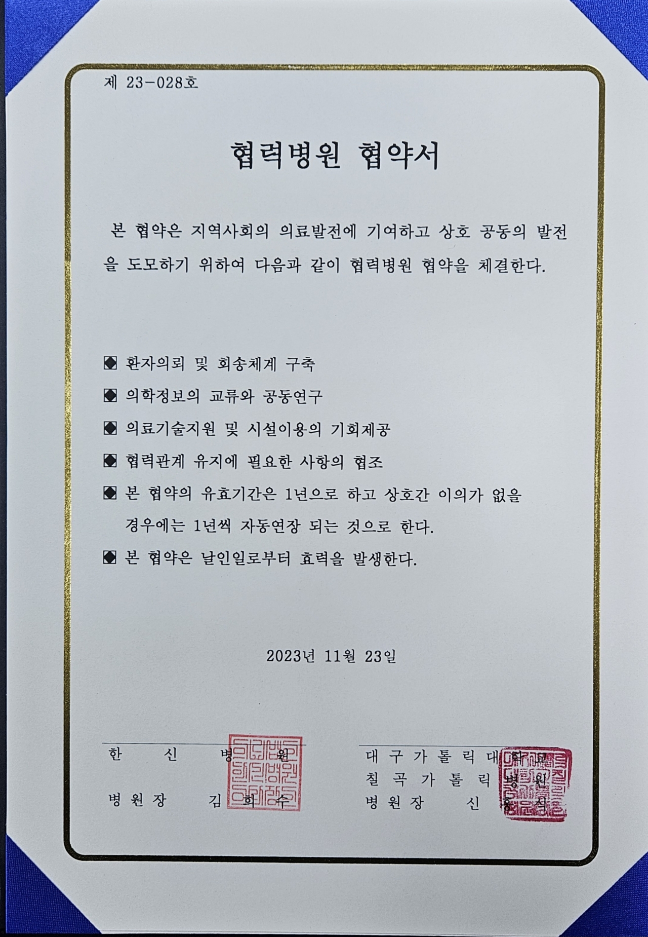 23년 11월 23일 (의)용각의료재단 한신병원과 대구가톨릭대학교 칠곡가톨릭병원이 서로 협력병원으로 협약을 체결하였습니다.