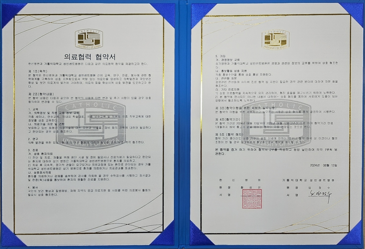 24년 06월 13일 (의)용각의료재단 한신병원과 가톨릭대학교 성빈센트병원이 서로 협력병원으로 협약을 체결하였습니다.