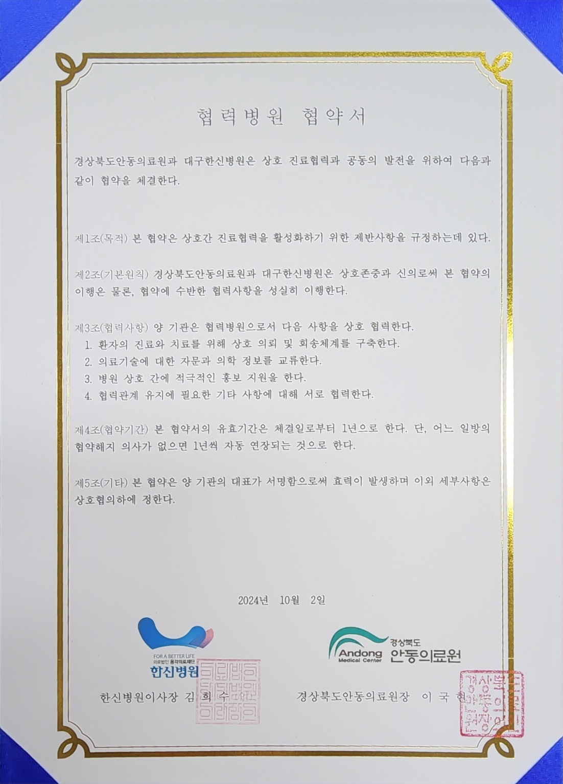 24년 10월 02일 (의)용각의료재단 한신병원과 안동의료원이 서로 협력병원으로 협약을 체결하였습니다.