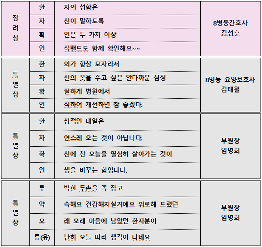 4행시 짓기는 전직원분들께서 참가하셨으며 전 부서 부서장님들과 병원 임직원분들께서 직접 심사해주셨습니다.