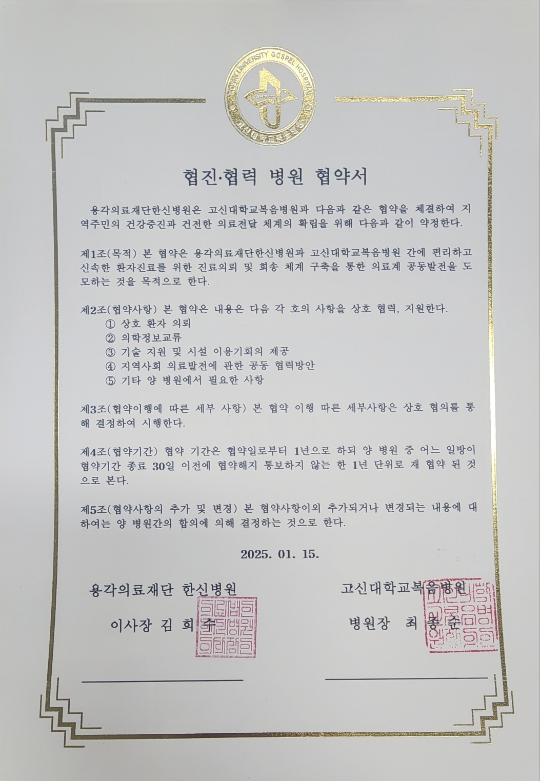 25년 01월 15일 (의)용각의료재단 한신병원과 고신대학교 복음병원이 서로 협력병원으로 협약을 체결하였습니다.